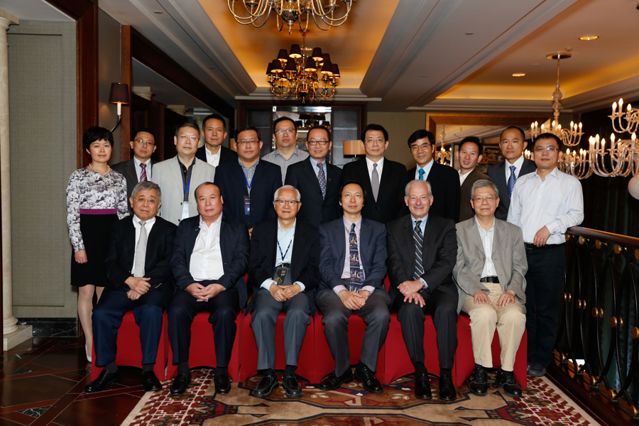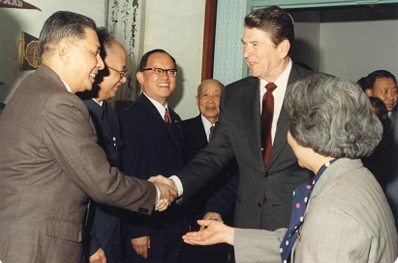 1984年美国总统里根访问复旦时会见苏步青、谢希德、谭其骧、华中一、蒋学模(左一)等教授