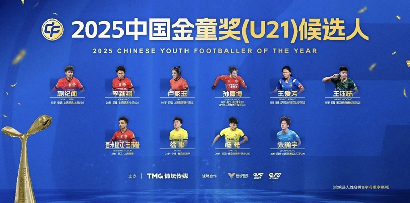 在中国金童奖评选U21组别,以11球荣膺2025赛季中超本土射手王、并收获了国家队生涯首球的王钰栋领衔入选;与其一同出战U20亚洲杯的蒯纪闻、杨希和朱鹏宇,同样在中超赛场汲取经验、崭露头角,他们均得到了“金童”提名。代表U22国家队出战U23亚洲杯预选赛的李新翔、吾米提江·玉苏普和徐彬,本赛季在俱乐部获得了稳定的出场时间。李新翔和吾米提江更是全程助力上海海港的争冠征程。另一位候选人——19岁孙康博在赛季中加盟辽宁铁人农商银行,坐稳主力位置,并在全运会决赛打入了绝平进球。