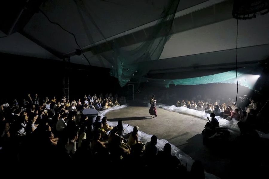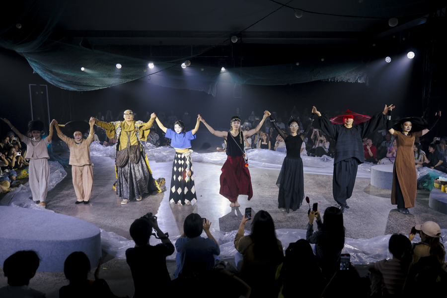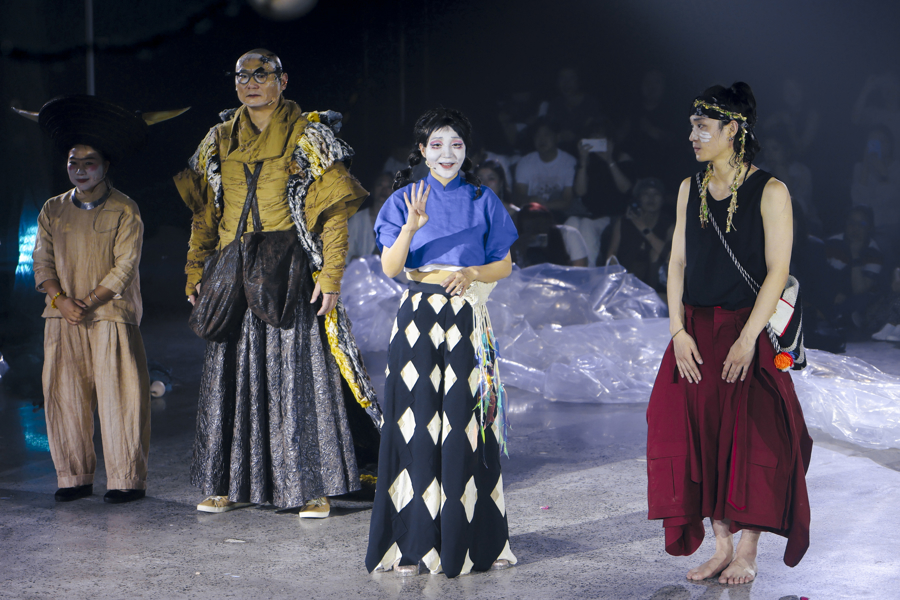 在舞台呈现上,阿朵沿用了她擅长的音乐肢体剧,只是这一次做得更极致:整场演出几乎没有传统对白,演员用音乐和肢体与观众联结。非遗大师现场配音,带来苗族芦笙与水腔,土家族咚咚喹,还有箫、鸟笛、中国鼓、锣、镲等十几种乐器的叠加,让乐手从演奏者化身为风、水、树等自然元素的“翻译官”。这是阿朵对“未来民族美学”的又一次探索:“这一次,我们不讲‘人话’,而是讲花语、树语、风语。”