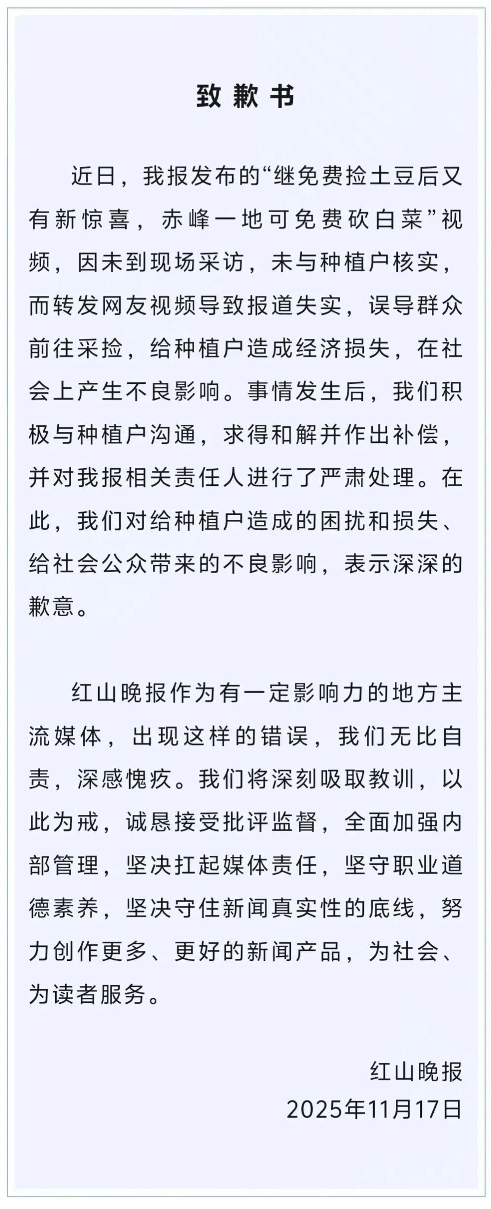 近日,我报发布的“继免费捡土豆后又有新惊喜,赤峰一地可免费砍白菜”视频,因未到现场采访,未与种植户核实而转发网友视频导致报道失实,误导群众前往采捡,给种植户造成经济损失,在社会上产生不良影响。事情发生后,我们积极与种植户沟通,求得和解并作出补偿,并对我报相关责任人进行了严肃处理。在此,我们对给种植户造成的困扰和损失给社会公众带来的不良影响,表示深深的歉意。