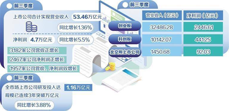 前三季度,上市公司整体业绩持续改善,与经济大盘稳中有进的步调同频共振。统计显示,前三季度,上市公司合计实现营业收入53.46万亿元、净利润4.7万亿元,同比分别增长1.36%、5.5%。3182家公司营收正增长,2467家公司净利润正增长,1957家公司营收、净利润双增长。分季度看,第三季度上市公司营收、净利润同比分别增长3.82%、11.45%,环比分别增长2.4%、14.12%,增速较上半年显著提升,逐季向好态势继续巩固。