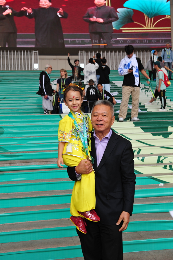 国际武联副主席、美国武术联合会主席吴廷贵与五岁小队员Angela wong在大赛现场