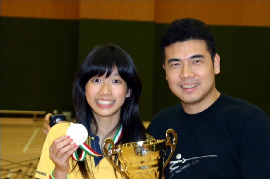香港女子花剑运动员关渝澄(左)与启蒙教练何泰顺。