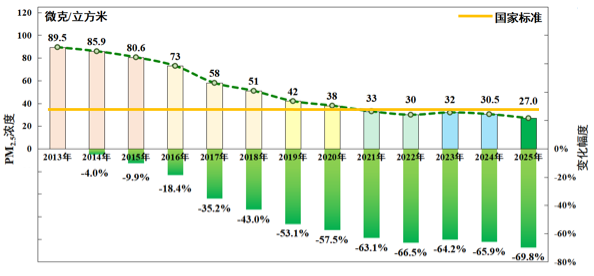 北京市PM2.5实现稳定达标。北京市开展大气污染防治以来,PM2.5保持长期改善趋势,从2013年的89.5微克/立方米,降至2025年的27.0微克/立方米,降幅达69.8%。其中,“十四五”时期,北京市PM2.5年均浓度连续五年达到国家标准并屡创新低,在2021年首次达到国家标准后,2025年较2020年再降三成。经过多年努力,北京市PM2.5已经实现稳定达标。
