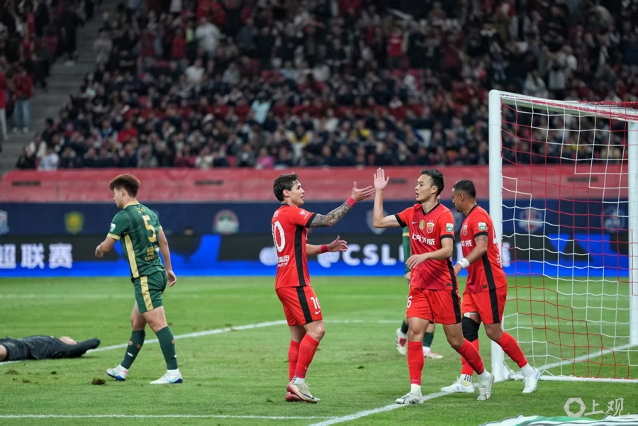 海港球员庆祝进球 新民晚报 李铭珅 摄