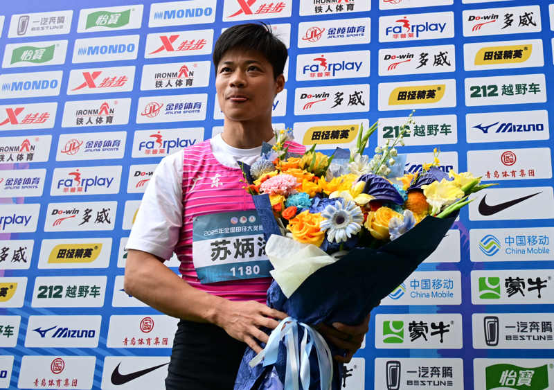 新华社照片,青岛(山东),2025年6月18日\n 6月18日,广东队选手苏炳添在男子100米预赛后接受采访。\n 当日,2025全国田径大奖赛(第五站)在山东青岛拉开帷幕。\n 新华社记者 李紫恒 摄