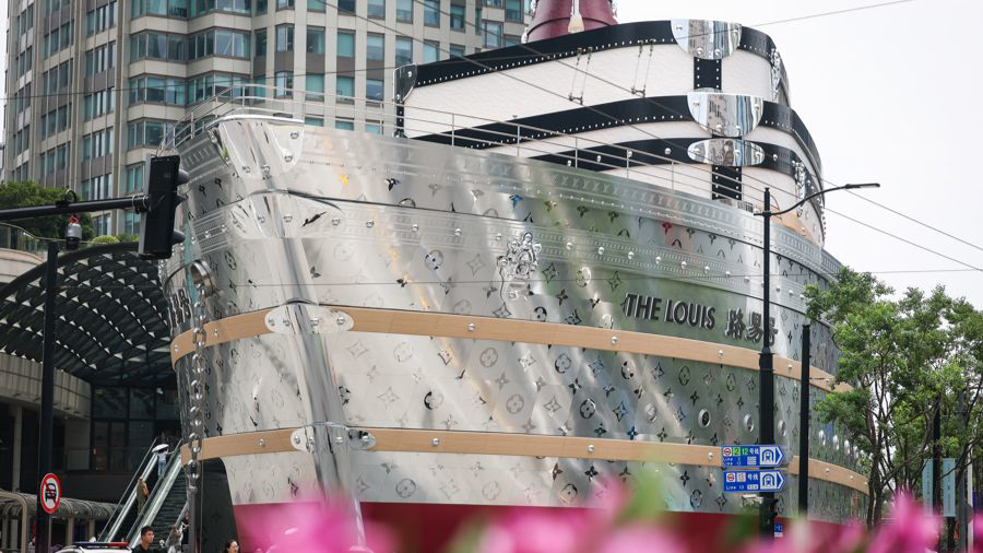 熙熙攘攘、车水马龙的南京西路商圈,一艘气势恢宏的巨轮出现在鳞次栉比的楼群中。巨轮外侧,国际知名奢侈品牌“路易威登”经典的“老花”图案直晃人眼,视觉张力、消费潜力、城市魅力直接拉满。