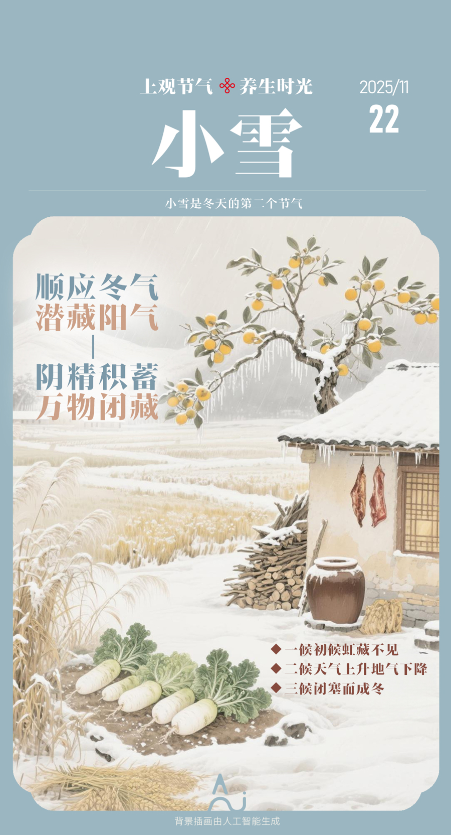 小雪节气当早卧晚起,保证充足的睡眠时间,以利阳气潜藏,阴精积蓄。《黄帝内经》有言:冬三月.......早卧晚起,必待日光。小雪属于冬季的节气,这个时候是草木凋零、落叶渐腐、冰冻虫伏的时节,是自然万物闭藏的季节,相对应的,人体的阴阳消长、代谢流通也相对缓慢。应该顺应自然天气之气,养护人体闭藏机能的规律,早睡晚起,多多休息,保证睡眠,减少高强度的体力活动,这乃是顺应冬气、养护人体闭藏机能的法则。