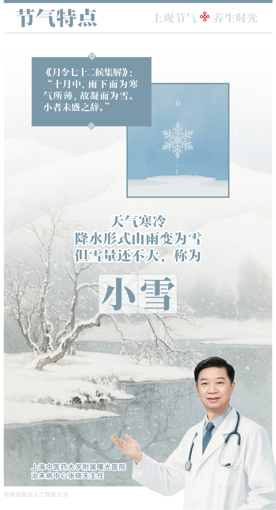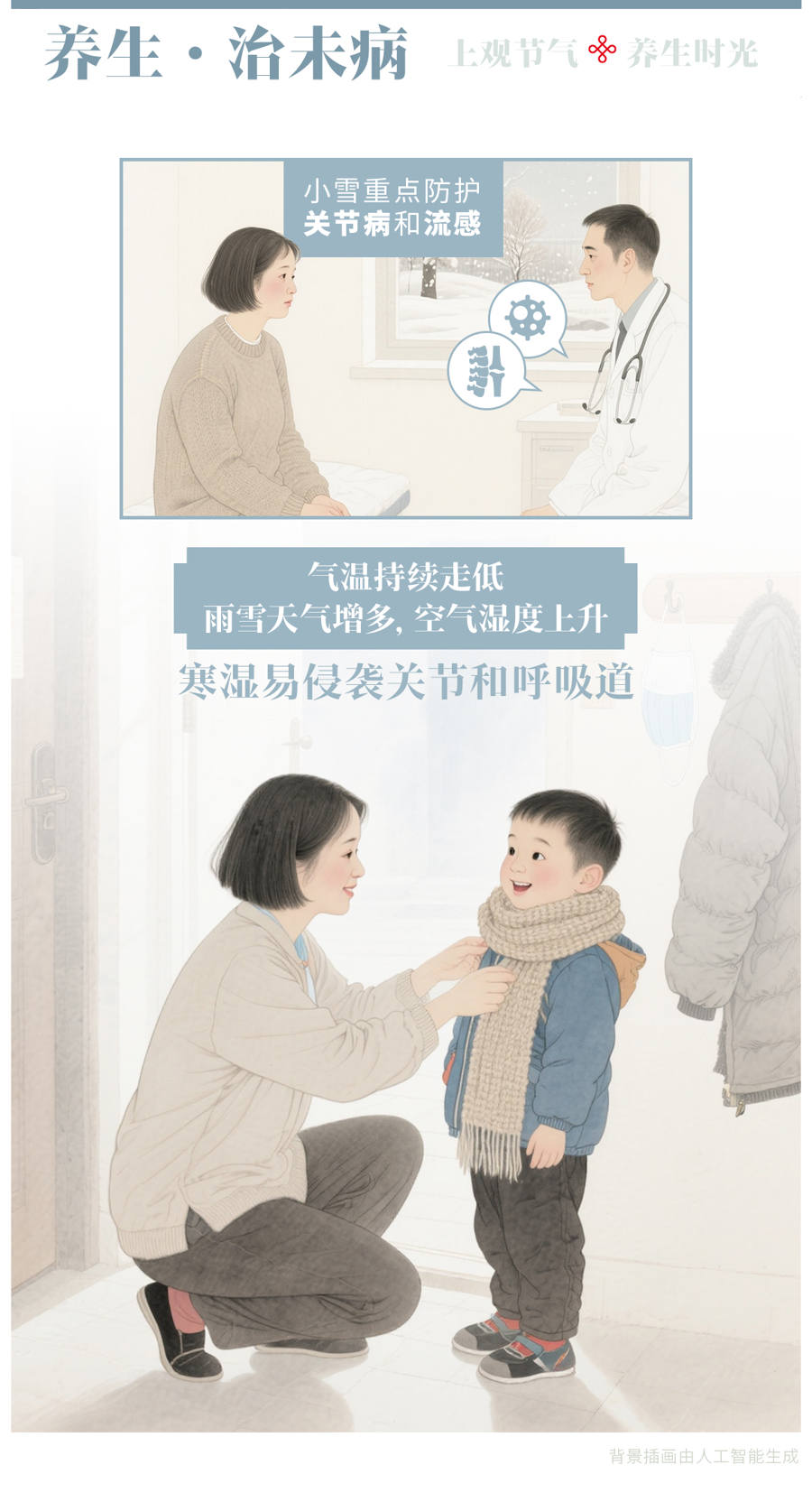 小雪重点防护关节病和流感。气温持续走低,雨雪天气增多,空气湿度上升,寒湿易侵袭关节和呼吸道。