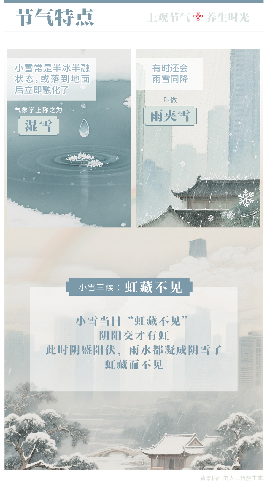 小雪常是半冰半融状态,或落到地面后立即融化了,气象学上称之为“湿雪”;有时还会雨雪同降,叫做“雨夹雪”。小雪三候 :虹藏不见:小雪当日“虹藏不见”,阴阳交才有虹,此时阴盛阳伏,雨水都凝成阴雪了,虹藏而不见。