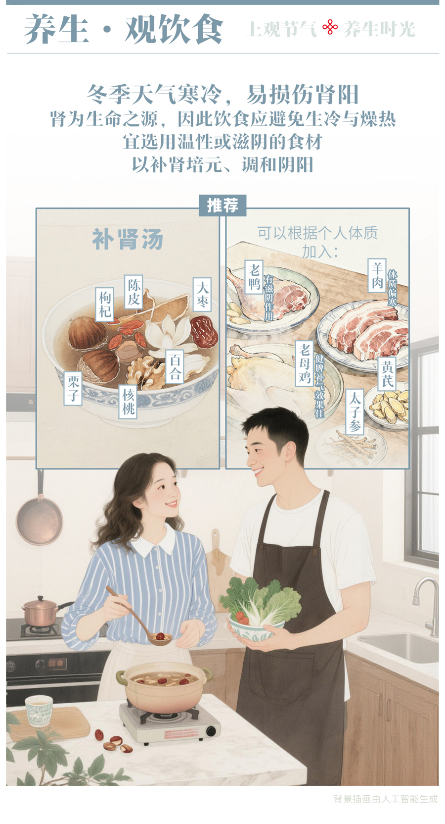 冬季天气寒冷,寒邪最易伤肾阳,而肾为人体的根本所在,是人体生命活动的源泉,滋五脏之阴气,发五脏之阳气。故冬季饮食既不宜生冷、也不宜燥热,当选用温性食物补肾温阳、培本固元,或养阴补肾之品滋阴潜阳、强身健体。