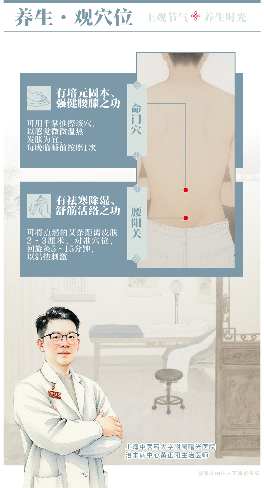 具有培元固本、强健腰膝之功,可用手掌推擦该穴,以感觉微微温热发胀为宜,每晚临睡前按摩1次。
