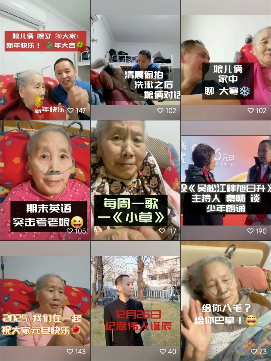 有时,是母亲为儿子唱起年轻时喜爱的歌。有时,是儿子靠在母亲身旁,为她念诗。有时恰逢节日,娘儿俩一起感怀往事,许下心愿。有时,是儿子一边照料母亲,一边斗嘴逗趣……这些视频有长有短,几乎看不见剪辑和花样,每条却都能得到百余个“赞”和“红星”。正如一位网友所言,“没有技巧,全是感情。为宋老师竖大拇指!”